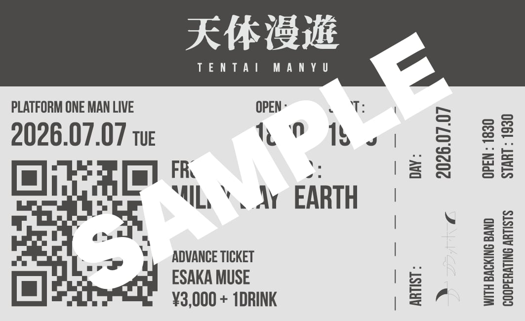 2026年7月7日(火)にESAKA MUSE(大阪・江坂)にて開催されるプラットホーム初のワンマンライブ、『天体漫遊』の公演チケットです。このチケットは、まるで搭乗券のようなデザインとなっており、素材は透明度の高いトレーシングペーパーを使用。このチケットを手に入れて、音を通して星を巡る旅へ一緒に出かけませんか?